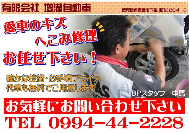 愛車のキズ・ヘコミをリーズナブルに修理したいなら増満自動車にお任せあれ!