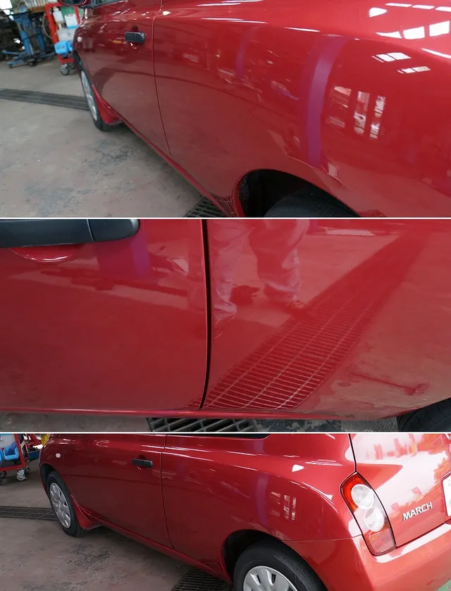 日産 マーチの事故車の左サイドの板金塗装での修理が完了いたしました。