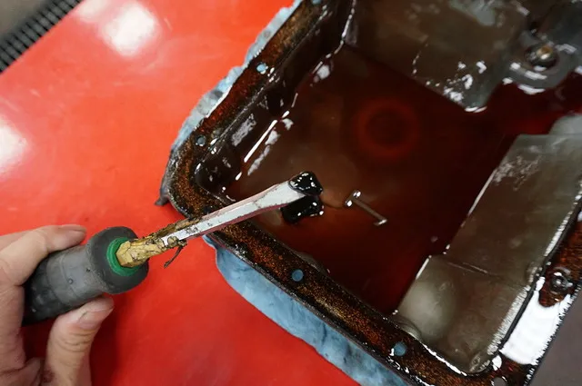 これが7万キロ走行したジムニーシエラのオイルパン内部です。ドライバーについているヘドロ状のものは、オイルパン内部の磁石に付着していたスラッジです。オイルパンの底にもうっすらとスラッジの膜のようなものが形成されています。10万キロ以上未交換だとどんなふうになってしまうにでしょうか・・・。このスラッジが大量に蓄積するとミッショントラブルのリスクが増大してしまいますよ。きれいに掃除してしまいましょう!
