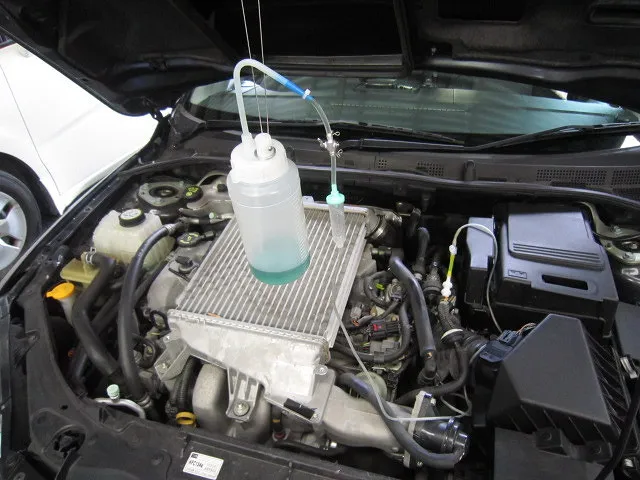 インテークマニホールドの負圧を利用してゆっくりと薬剤を注入していきます。 一番目の写真とは、ホースの接続方法が違いますがコチラが正解です。上の接続方法では、4番シリンダーに集中して薬剤が吸い込まれてしまうので、残りのシリンダーへの効果が薄くなってしまいます。シンプルな作業ではありますが、接続位置の選定にはそれなりの知識が必要なんです。