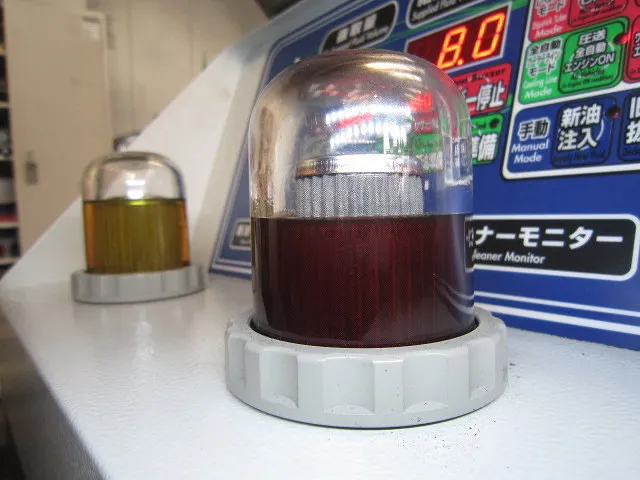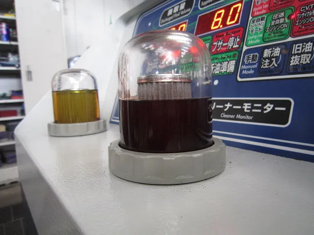 交換完了後、再びクリーニングモードでスラッジ除去。ご覧のように透明度がでてきました。奥の新油のように完全な黄緑色ではありませんが、ほとんど入れ替わっていますよ。最後に油量調整を行って完了です! 高性能ATFのフィーリングをお楽しみ下さい。