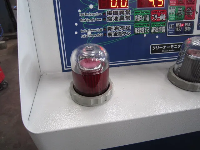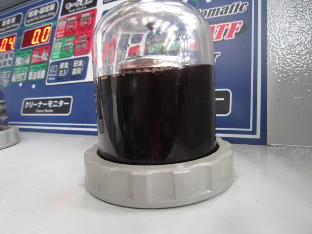 コチラは洗浄用に使用するATF、きれいな赤褐色ですね。規定量を一気に圧送したのち、循環クリーニングモードで新油が洗い流したミッション内部のスラッジを、トルコン太郎内部のフィルターで30分ほどかけて捕まえていきます。ここが最も重要なポイントなんです。
