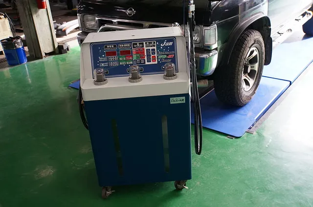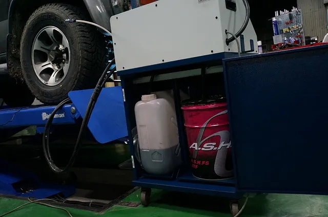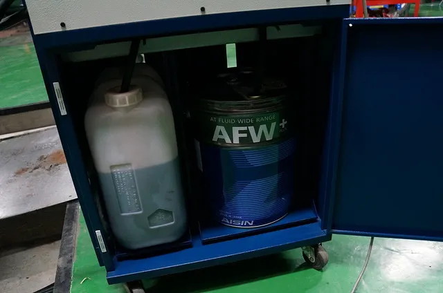 アイシンAFW+をセットし、10リッターを一気に圧送交換。その後30分ほどミッション内部を循環洗浄します。