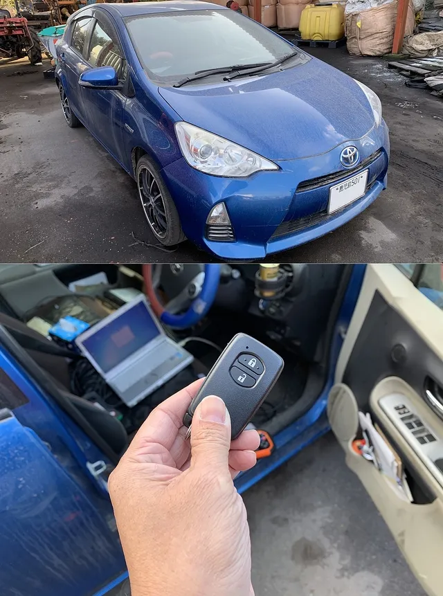 都城市でスマートキーを紛失してしまい移動できなくなったトヨタのプリウス。ホームページを見て「救急コール」を頂きました。このタイプのプリウスのスマートキーは常時在庫しているので即時対応可能ですよ。少し遠方ではありましたが、お見積りを提示すると、すぐに「おねがいします!」とご依頼いただきました。ドアロック状態なので、まずはピッキングで運転席のドアを開錠。準備していたスマートキーを特殊な方法で登録します。次はドアキーシリンダーからの情報をもとにインテリジェントキーの作成を行います。最近のトヨタは特殊なカギを採用しており、現地で作成できる業者さんが少ないのが現状ですが、増満自動車では特殊キー作成に対応可能なマシンを使用して現地作成が出来るんです。スマートキーの登録とインテリジェントキーの作成が終わり、作動確認をして完了です!