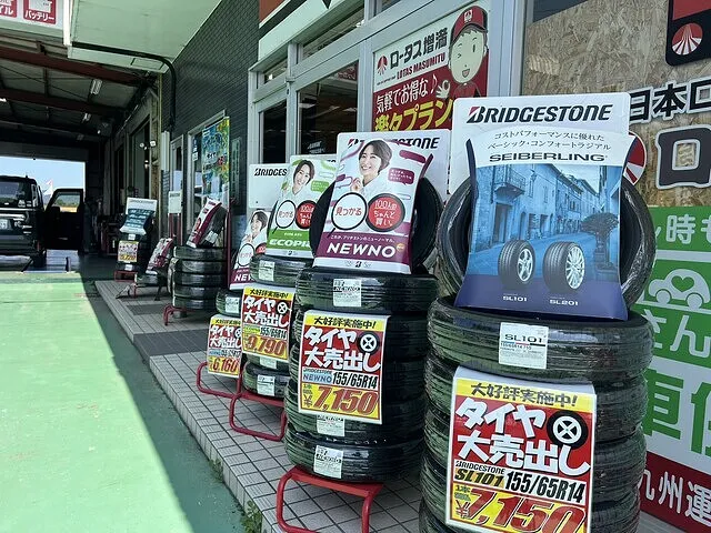 店舗前にはずらりと並ぶブリヂストンや他メーカーのタイヤが目を引きます。
