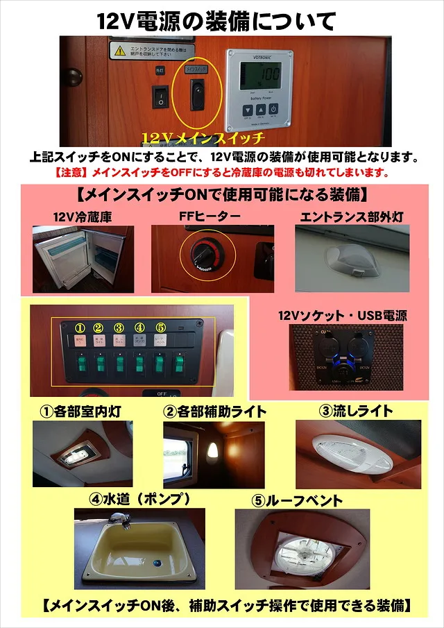 冷蔵庫がありますので基本的にレンタル中は12VメインスイッチはONのままがいいと思います。電気には限りがありますので、使わないライト等は消しておきましょう。