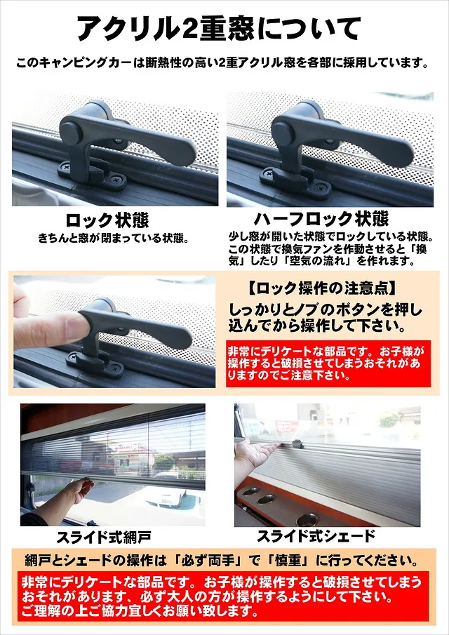 窓をロックせずに走行すると風にあおられ窓が破損し非常に危険です。走行開始前にチェックをお願いします。