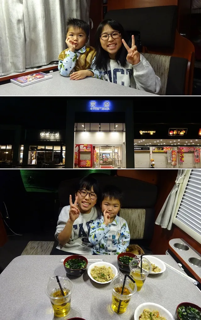 子供たちはお腹が空いていたのと、初めての車内での食事で2・3杯お代わりしていました。