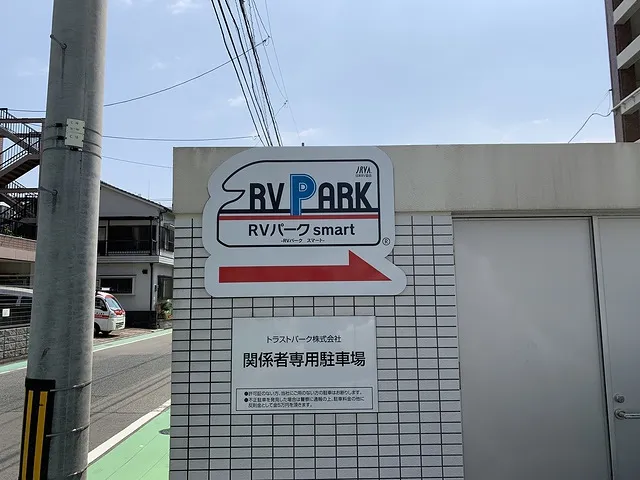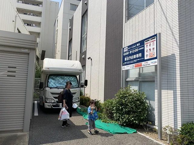 RVパークsmart博多はトラストパーク株式会社さんの駐車場内にあります。RVパークsmartは通常のRVパークとは予約方法や使用方法が異なり、「予約はWEBからのみ」「現地での受付もQRコードの認証のみ」で完全無人となっています。無人なので夜中に到着しても問題ありません、受付時間に縛られない旅の工程を組むことができるので、キャンピングカーとの相性はバッチリです。入庫可能時間が「当日の18時~翌日の16時」までとなっているので、RVパークに前泊してから、翌日の夕方まで車をとめたまま遊びに行くことができます。