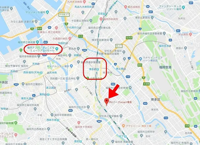 今回はアンパンマンこどもミュージアムに行くのが目的で利用しました。アンパンマンこどもニュージアムには駐車場がないので、キャンピングカーをRVパークに駐車したまま博多駅まで徒歩で移動、博多駅から地下鉄に乗り「中洲川端」でおりれば目の前のビルにアンパンマンミュージアムがあります。RVパークから博多駅までは歩いて20分ほどの距離です(小さいお子さんがいるのであればタクシーを利用した方がいいかもしれませんね)