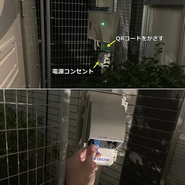 駐車スペースの奥の機械に、予約後に生成されるQRコードをかざすと電源を使用することが出来るようになります。QRコードの認証をスマートフォンの画面で行う場合は、画面の明るさを最大にしておかないと認識しないことがありますので注意して下さいね。