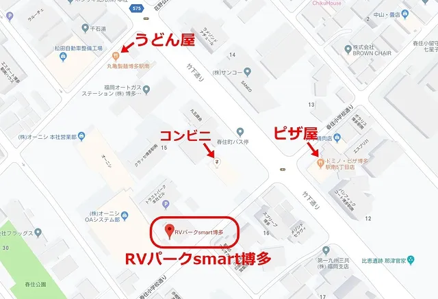 RVパークsmart博多の周りには、すぐ近くに「セブンイレブン」「ピザ屋」「丸亀正麺」「ドラッグストア」「銭湯」などがあり、食事や急な買い出しが必要な場合も非常に便利。博多観光の拠点として活躍しそうなRVパークです。