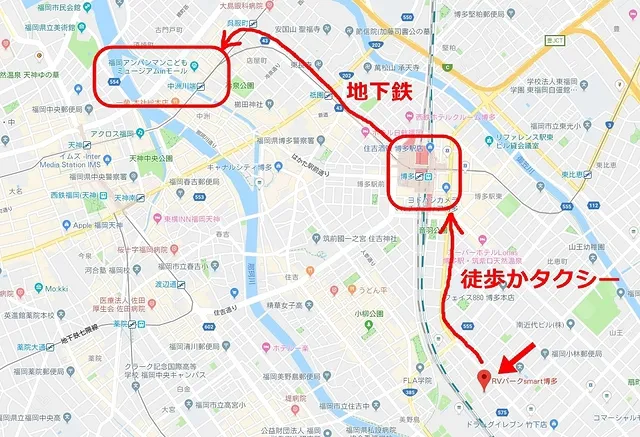 おはようございます!本日はアンパンマンこどもミュージアムに向けて朝から活動開始です。16時までRVパークを利用できるのでキャンピングカーはRVパークでそのままお留守番してもらい、徒歩で博多駅まで向かいました。大人の足で20分、小さい子供がいると30分ほどかかると思います。私たちは、まだ歩けない0歳児を抱えながらの移動でしたので博多駅に着く頃にはヘトヘトになってしまいました。帰りは迷わずタクシーを利用しましたよ(笑)タクシーなら1メーターで5~6分程度、クーラーの効いた車内で家族4人快適に移動できました。ありがとうタクシー!